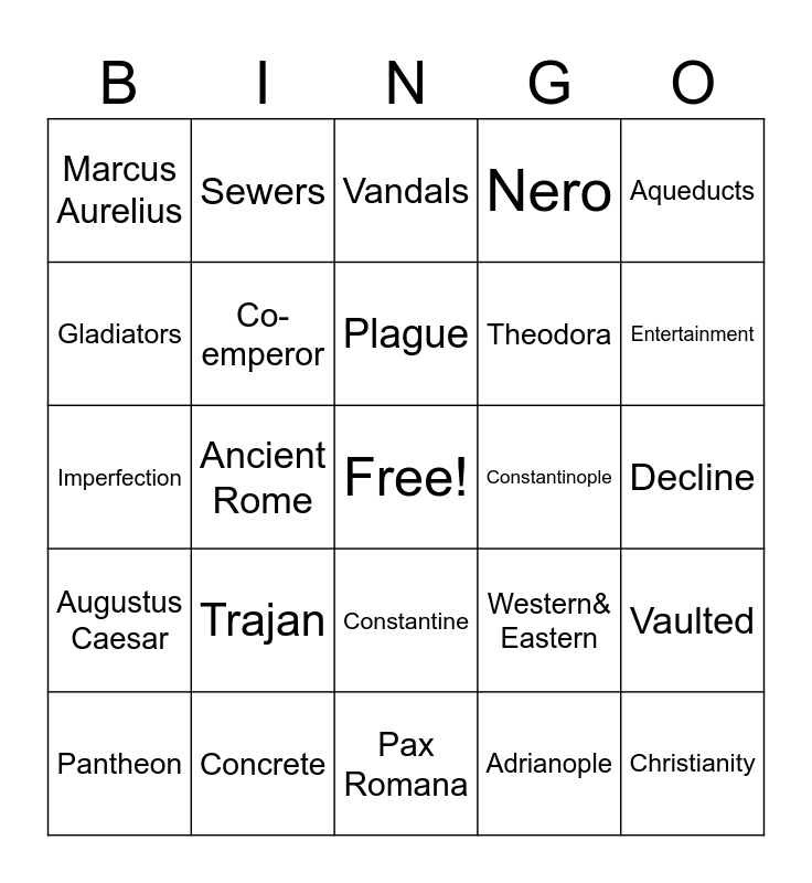 This bingo card has a free space and 24 words: Trajan, Concrete, Plague, Pantheon, Aqueducts, Marcus Aurelius, Gladiators, Sewers, Constantinople, Constantine, Theodora, Imperfection, Western& Eastern, Vaulted, Co-emperor, Adrianople, Decline, Vandals, Entertainment, Ancient Rome, Christianity, Augustus Caesar, Nero and Pax Romana.