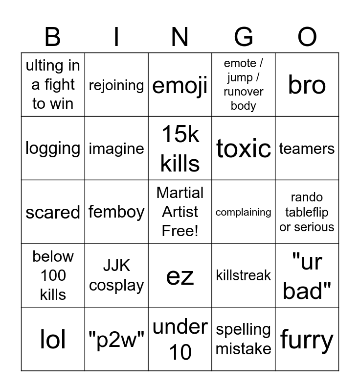 This bingo card has a free space and 24 words: JJK cosplay, "p2w", 15k kills, lol, bro, ulting in a fight to win, logging, rejoining, complaining, ez, toxic, scared, killstreak, "ur bad", imagine, spelling mistake, rando tableflip or serious, emoji, teamers, femboy, furry, below 100 kills, emote / jump / runover body and under 10.