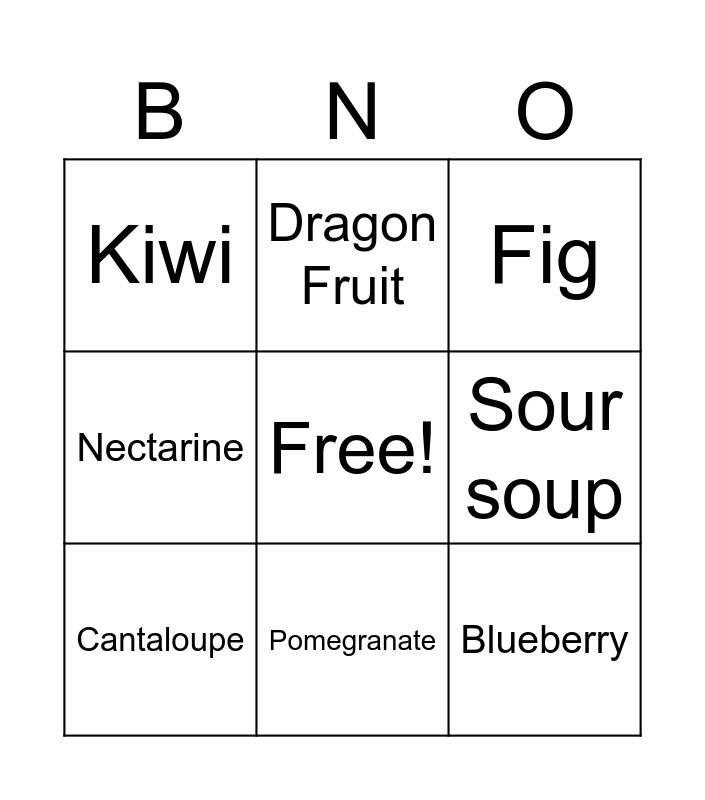 This bingo card has a free space and 10 words: Pomegranate, Fig, Kiwi, Blueberry, Nectarine, Cantaloupe, Dragon Fruit, Lychee, Sour soup and Star Fruit.