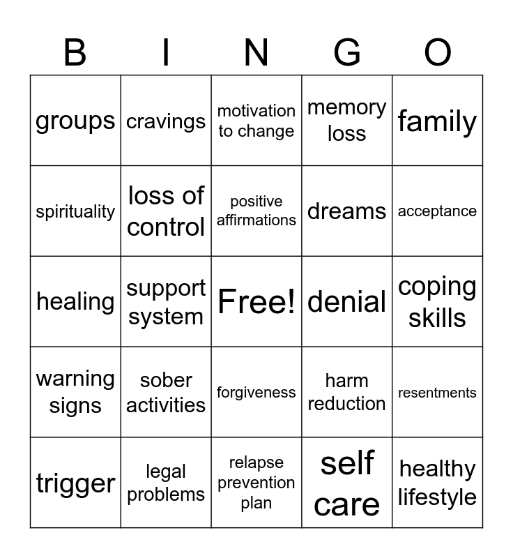 This bingo card has a free space and 29 words: trigger, sponsor, support system, meetings, groups, motivation to change, loss of control, sober activities, denial, legal problems, coping skills, healthy lifestyle, relapse prevention plan, self care, acceptance, healthy boundaries, forgiveness, warning signs, family, healing, harm reduction, 12 steps, dreams, spirituality, memory loss, cravings, resentments, positive affirmations and consequences.