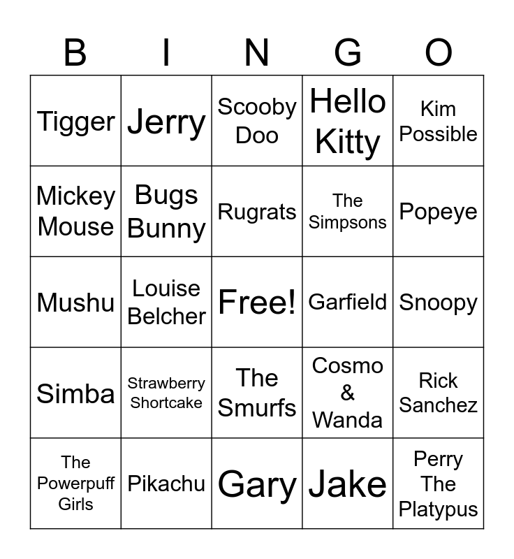 This bingo card has a free space and 24 words: Strawberry Shortcake, Pikachu, Rugrats, The Powerpuff Girls, Kim Possible, Tigger, Mickey Mouse, Jerry, Garfield, The Smurfs, The Simpsons, Mushu, Cosmo & Wanda, Rick Sanchez, Bugs Bunny, Jake, Snoopy, Scooby Doo, Popeye, Louise Belcher, Perry The Platypus, Simba, Hello Kitty and Gary.
