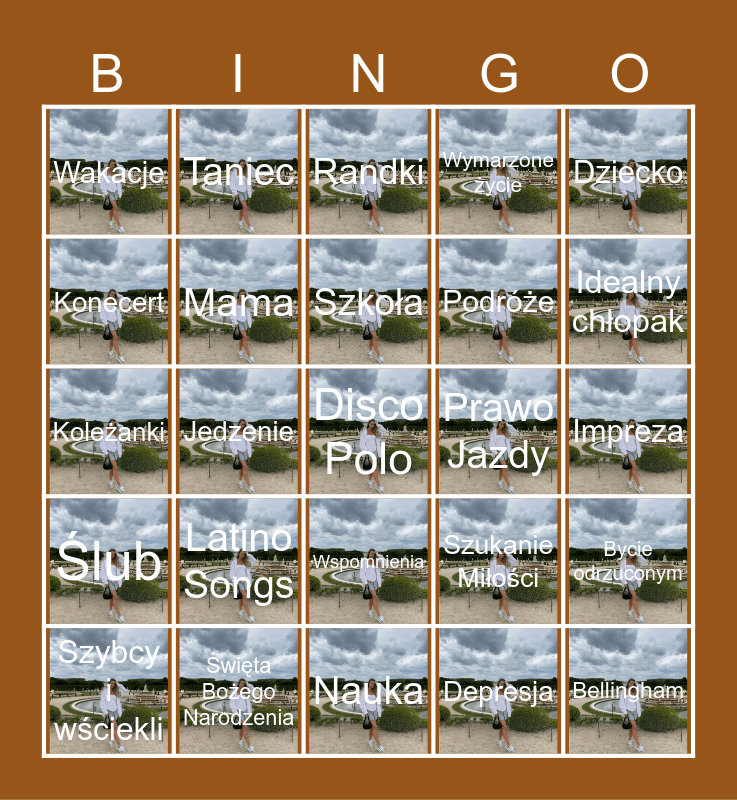 This bingo card has 24 images, a free space and 24 words: Latino Songs, Święta Bożego Narodzenia, Szkoła, Szybcy i wściekli, Dziecko, Wakacje, Konecert, Taniec, Prawo Jazdy, Wspomnienia, Podróże, Koleżanki, Szukanie Miłości, Bycie odrzuconym, Mama, Depresja, Impreza, Randki, Idealny chłopak, Jedzenie, Bellingham, Ślub, Wymarzone życie and Nauka.