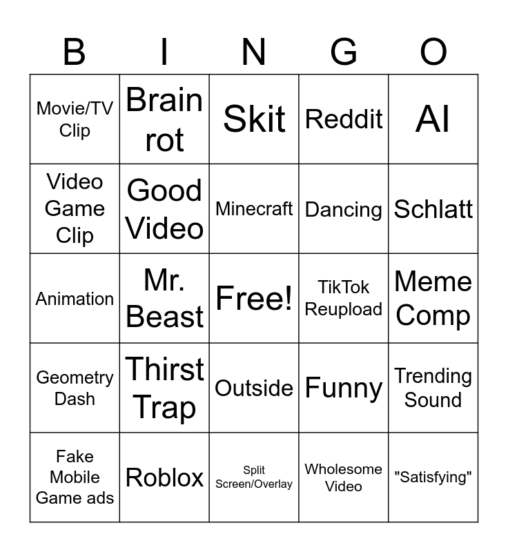 This bingo card has a free space and 24 words: Thirst Trap, Roblox, Minecraft, Fake Mobile Game ads, AI, Movie/TV Clip, Video Game Clip, Brain rot, TikTok Reupload, Outside, Dancing, Animation, Funny, Trending Sound, Good Video, Wholesome Video, Meme Comp, Skit, Schlatt, Mr. Beast, "Satisfying", Geometry Dash, Reddit and Split Screen/Overlay.