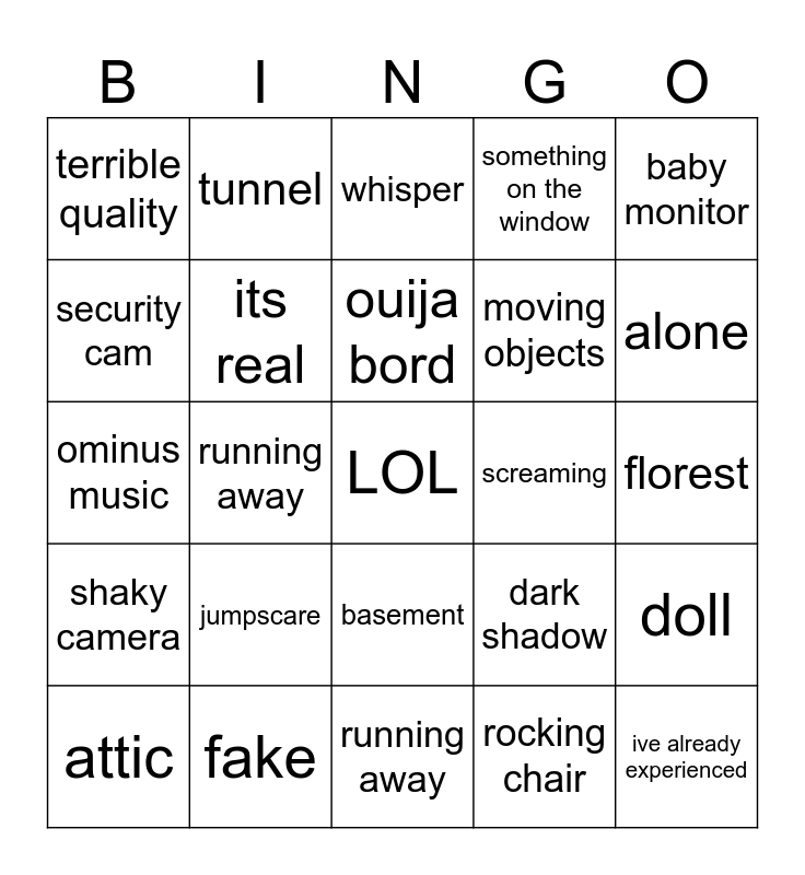 This bingo card has a free space and 24 words: jumpscare, fake, ouija bord, attic, baby monitor, terrible quality, security cam, tunnel, screaming, basement, moving objects, ominus music, dark shadow, doll, its real, rocking chair, florest, whisper, alone, running away, ive already experienced, shaky camera, something on the window and running away.