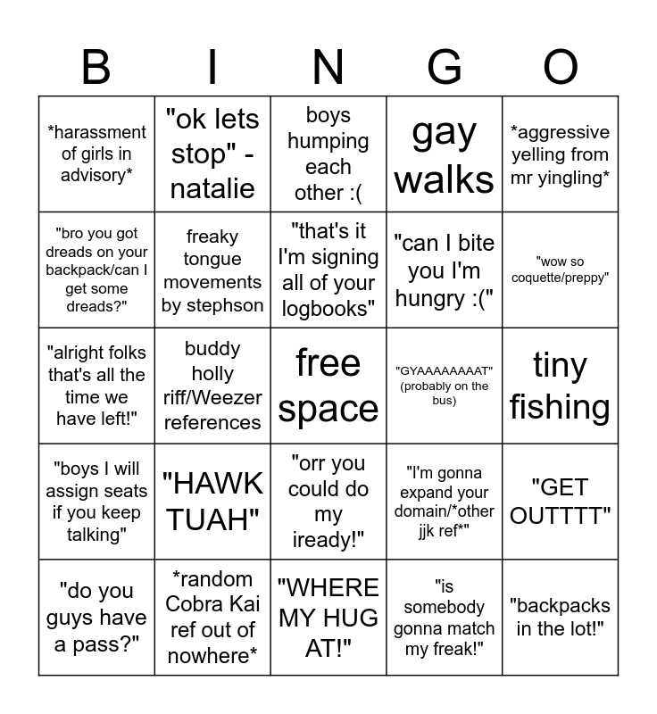 This bingo card has a free space and 24 words: "HAWK TUAH", *random Cobra Kai ref out of nowhere*, "that's it I'm signing all of your logbooks", "do you guys have a pass?", *aggressive yelling from mr yingling*, *harassment of girls in advisory*, "bro you got dreads on your backpack/can I get some dreads?", "ok lets stop" -natalie, "GYAAAAAAAAT" (probably on the bus), "orr you could do my iready!", "can I bite you I'm hungry :(", "alright folks that's all the time we have left!", "I'm gonna expand your domain/*other jjk ref*", "GET OUTTTT", freaky tongue movements by stephson, "is somebody gonna match my freak!", tiny fishing, boys humping each other :(, "wow so coquette/preppy", buddy holly riff/Weezer references, "backpacks in the lot!", "boys I will assign seats if you keep talking", gay walks and "WHERE MY HUG AT!".