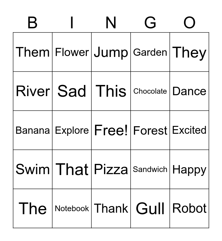 This bingo card has a free space and 25 words: That, Thank, This, The, They, Them, River, Flower, Forest, Pizza, Chocolate, Banana, Sandwich, Happy, Sad, Silly, Excited, Jump, Dance, Explore, Robot, Notebook, Swim, Garden and Gull.