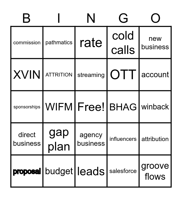 This bingo card has a free space and 29 words: proposal, cpm, WIFM, revenue, commission, rate, ATTRITION, gap plan, BHAG, budget, winback, groove flows, leads, salesforce, account, cpp, agency business, direct business, new business, sponsorships, influencers, TTWN, OTT, XVIN, cold calls, pathmatics, attribution, streaming and podcasts.