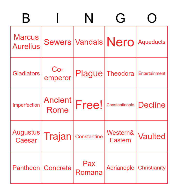 This bingo card has a free space and 24 words: Trajan, Concrete, Plague, Pantheon, Aqueducts, Marcus Aurelius, Gladiators, Sewers, Constantinople, Constantine, Theodora, Imperfection, Western& Eastern, Vaulted, Co-emperor, Adrianople, Decline, Vandals, Entertainment, Ancient Rome, Christianity, Augustus Caesar, Nero and Pax Romana.