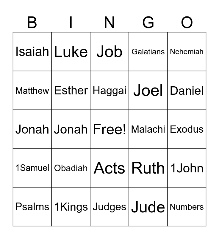 This bingo card has a free space and 29 words: Genesis, 1Kings, Job, 1Peter, Nehemiah, Isaiah, Esther, Haggai, Malachi, 1John, Psalms, Jonah, Jude, Numbers, Jonah, Luke, Judges, Ruth, Daniel, 1Samuel, Obadiah, Proverbs, Joel, Exodus, Matthew, Luke, Acts, Galatians and Titus.