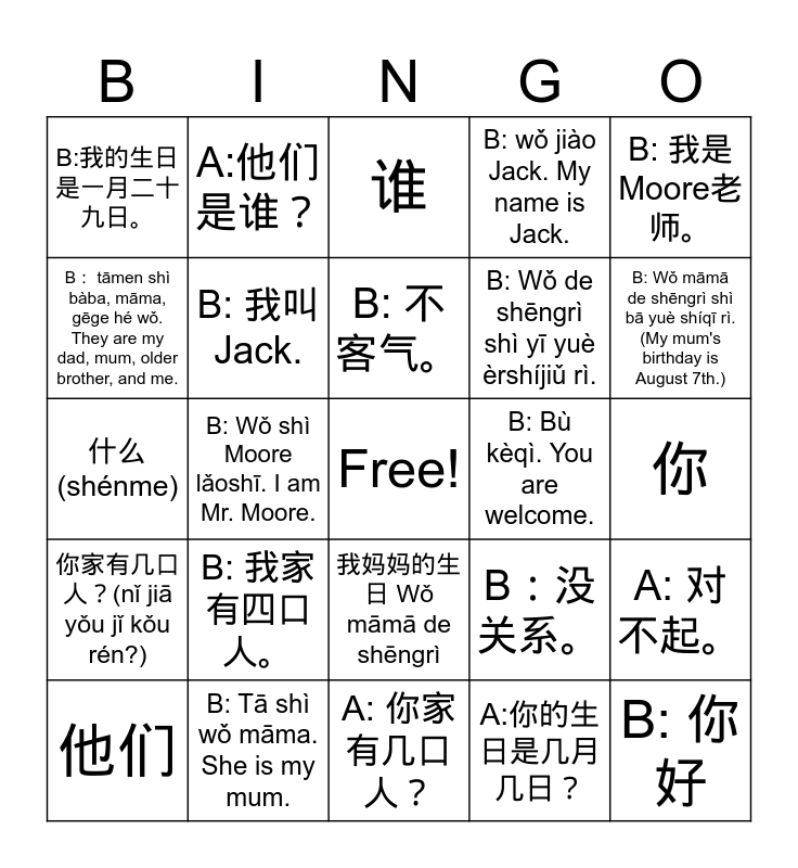 This bingo card has a free space and 51 words: A: 你好, B: 你好, B: Nǐ hǎo; Hello, A: 你家有几口人?, B: 我家有四口人。, B: wǒ jiā yǒu sì kǒu rén. ( There are four people in my family), A:他们是谁?, B:他们是爸爸,妈妈,哥哥和我。, B: tāmen shì bàba, māma, gēge hé wǒ. They are my dad, mum, older brother, and me., A: 你叫什么名字?, B: 我叫Jack., B: wǒ jiào Jack. My name is Jack., A: 对不起。, B:没关系。, B: Méiguānxì. That's all right., A:谢谢, B: 不客气。, B: Bù kèqì. You are welcome., A: 你是Moore 老师吗?, B: 我是Moore老师。, B: Wǒ shì Moore lǎoshī. I am Mr. Moore., A:你的生日是几月几日?, B:我的生日是一月二十九日。, B: Wǒ de shēngrì shì yī yuè èrshíjiǔ rì., A:你妈妈的生日是几月几日?, B: 我妈妈的生日是八月十七日。, B: Wǒ māmā de shēngrì shì bā yuè shíqī rì.(My mum's birthday is August 7th.), 他, 他们, 谁, A:他是谁?, B:他是我爸爸。, B: Tā shì wǒ bàba. He is my dad., A: 她是谁?, B:她是我妈妈。, B: Tā shì wǒ māma. She is my mum., 几, 口, 人, 家, 你, 你家有几口人?(nǐ jiā yǒu jǐ kǒu rén?), 她 (tā), 谁 shéi, 生日 (shēngrì), 叫 jiào, 什么 (shénme), 名字 (míngzi), 的, 我妈妈的生日 Wǒ māmā de shēngrì and 我爸爸的生日是五月三日。Wǒ bàba de shēngrì shì wǔ yuè sān rì..