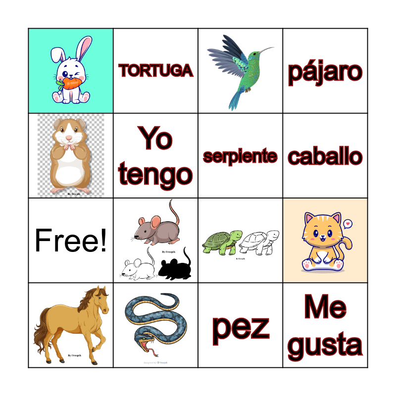 This bingo card has 10 images and 10 words: Free!, TORTUGA, Yo tengo, Me gusta, serpiente, ratón, caballo, pájaro, pez and conejo.