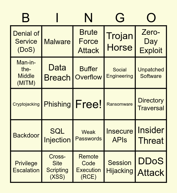 This bingo card has a free space and 24 words: SQL Injection, Cross-Site Scripting (XSS), Buffer Overflow, Privilege Escalation, Zero-Day Exploit, Denial of Service (DoS), Man-in-the-Middle (MITM), Malware, Ransomware, Weak Passwords, Social Engineering, Cryptojacking, Insecure APIs, Insider Threat, Data Breach, Session Hijacking, Directory Traversal, Brute Force Attack, Unpatched Software, Phishing, DDoS Attack, Backdoor, Trojan Horse and Remote Code Execution (RCE).