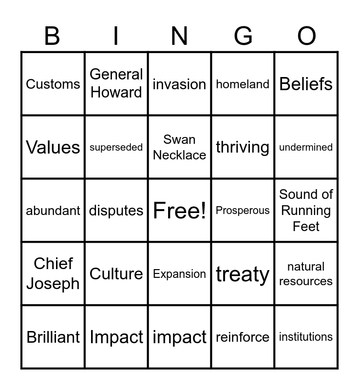 This bingo card has a free space and 24 words: Culture, Impact, Swan Necklace, Brilliant, Beliefs, Customs, Values, General Howard, Prosperous, Expansion, thriving, abundant, treaty, natural resources, superseded, reinforce, Sound of Running Feet, invasion, undermined, disputes, institutions, Chief Joseph, homeland and impact.