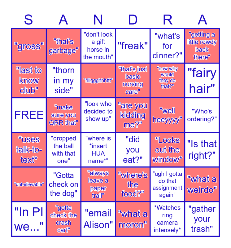 This bingo card has 36 words: "where's the food?", "always leave a paper trail", "what a moron", "last to know club", *uses talk-to-text*, "are you kidding me?", "thorn in my side", "email Alison", "what's for dinner?", "ugh I gotta do that assignment again", "fairy hair", "freak", "what a weirdo", "make sure you QRR that", "that's just basic nursing care", "gross", "unbelievable", "well heeyyyy", FREE, "don't look a gift horse in the mouth", "look who decided to show up", "dropped the ball with that one", "did you eat?", "where is *insert HUA name*", *Looks out the window*, "that's garbage", "now why would they do that?", "gotta check the crash cart", "riiiggghhhttt", "getting a little rowdy back there", "gather your trash", "In PI we...", "Is that right?", "Who's ordering?", "Gotta check on the dog" and *Watches ring camera intensely*.