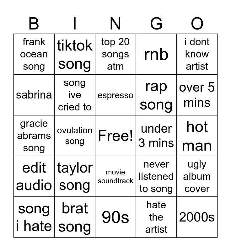 This bingo card has a free space and 24 words: taylor song, brat song, espresso, song i hate, i dont know artist, frank ocean song, sabrina, tiktok song, under 3 mins, movie soundtrack, rap song, gracie abrams song, never listened to song, ugly album cover, song ive cried to, hate the artist, hot man, top 20 songs atm, over 5 mins, ovulation song, 2000s, edit audio, rnb and 90s.