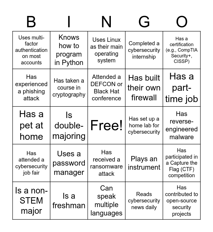 This bingo card has a free space and 24 words: Uses a password manager, Is a freshman, Attended a DEFCON or Black Hat conference, Is a non-STEM major, Has a certification (e.g., CompTIA Security+, CISSP), Uses multi-factor authentication on most accounts, Has experienced a phishing attack, Knows how to program in Python, Has set up a home lab for cybersecurity, Has received a ransomware attack, Has built their own firewall, Has a pet at home, Plays an instrument, Has participated in a Capture the Flag (CTF) competition, Has taken a course in cryptography, Reads cybersecurity news daily, Has reverse-engineered malware, Uses Linux as their main operating system, Has a part-time job, Is double-majoring, Has contributed to open-source security projects, Has attended a cybersecurity job fair, Completed a cybersecurity internship and Can speak multiple languages.