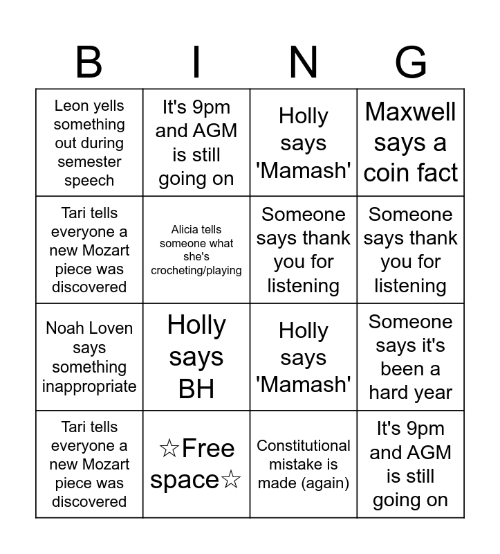 ⚠ This card has duplicate items: Someone says it's been a hard year (4), Leon yells something out during semester speech (4), Holly says BH (4), Noah Loven says something inappropriate (4), Leon is purposefully contradictory (4), It's 9pm and AGM is still going on (4), Maxwell says a coin fact (4), Someone says thank you for listening (4), Holly says 'Mamash' (4), Leon there's too many roles (3rd time) (2), Noah nominates for security (4), Constitutional mistake is made (again) (4), Tari tells everyone a new Mozart piece was discovered (4), Leon votes for RON (4), ☆Free space☆ (3), Hineni is mentioned (again) (2), Leon says there's too many roles (3rd time) (2)