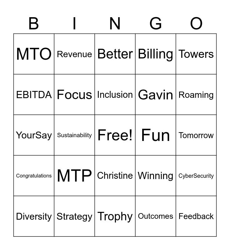 This bingo card has a free space and 24 words: MTP, Strategy, Inclusion, Diversity, Towers, MTO, EBITDA, Revenue, Fun, Christine, Gavin, YourSay, Winning, CyberSecurity, Focus, Outcomes, Tomorrow, Better, Roaming, Sustainability, Feedback, Congratulations, Billing and Trophy.