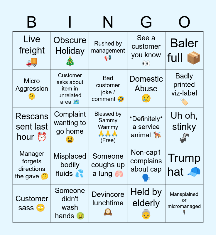This bingo card has a free space and 30 words: Someone didn't wash hands ๐คข, Rescan of bin picked nothing โ๏ธ, Complaint wanting to go home ๐ซ, Customer says nothing but 1 word / item ๐ค, Live freight ๐, Rushed by management ๐ข, Customer asks about item in unrelated area ๐บ, Someone coughs up a lung ๐ซ, *Definitely* a service animal ๐โ๐ฆบ, Devincore lunchtime ๐ฐ, Uh oh, stinky ๐ฆจ, Mansplained or micromanaged ๐ด, Held by elderly ๐ต, Customer pushes by ๐, Badly printed viz-label ๐ท, Item in wrong bin ๐, Non-cap1 complains about cap ๐ฃ, Manager forgets directions the gave ๐ค, Misplaced bodily fluids ๐ฆ, Baler full ๐ฆ, Rescans sent last hour โฐ๏ธ, "Team lift" โ๏ธ, Obscure Holiday ๐, Domestic Abuse ๐ข, Micro Aggression ๐ซ , See a customer you know ๐, Trump hat ๐งข, Customer sass ๐, Bad customer joke / comment ๐คฃ and Hemorrhoid cream mentioned ๐ซง.
