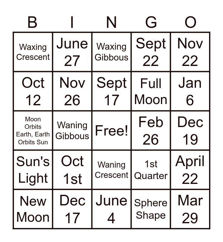 This bingo card has a free space and 24 words: Oct 1st, Dec 17, Sept 17, New Moon, Nov 22, Waxing Crescent, Oct 12, June 27, Feb 26, Waning Crescent, Full Moon, Moon Orbits Earth, Earth Orbits Sun, 1st Quarter, April 22, Nov 26, Sphere Shape, Dec 19, Waxing Gibbous, Jan 6, Waning Gibbous, Mar 29, Sun's Light, Sept 22 and June 4.