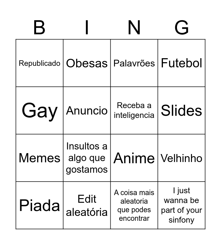 This bingo card has 16 words: Edit aleatória, Velhinho, Palavrões, Republicado, Memes, Obesas, Anime, A coisa mais aleatoria que podes encontrar, Gay, Anuncio, Piada, Futebol, Insultos a algo que gostamos, Slides, Receba a inteligencia and I just wanna be part of your sinfony.