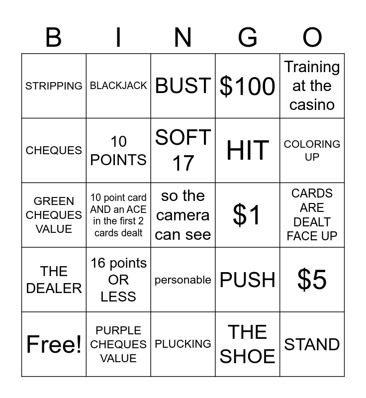 This bingo card has 27 words: PUSH, STAND, HIT, PLUCKING, CHEQUES, BUST, BLACKJACK, THE DEALER, $1, $5, GREEN CHEQUES VALUE, $100, Free!, PURPLE CHEQUES VALUE, COLORING UP, FACE CARDS, 10 POINTS, SOFT 17, 16 points OR LESS, STRIPPING, CARDS ARE DEALT FACE UP, THE SHOE, 10 point card AND an ACE in the first 2 cards dealt, so the camera can see, personable, Training at the casino and the player on your left.