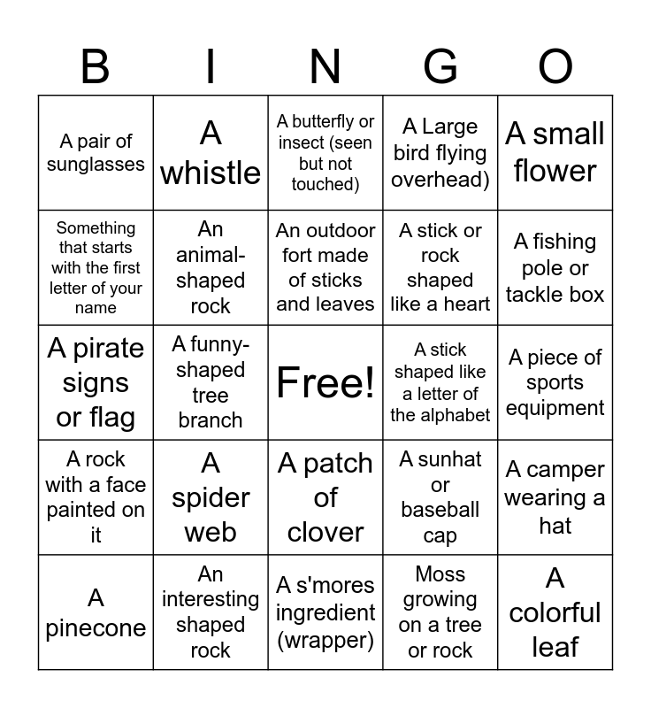 This bingo card has a free space and 43 words: A smooth rock, A colorful leaf, A feather, A pinecone, A spider web, Moss growing on a tree or rock, A butterfly or insect (seen but not touched), A feather, A small flower, An interesting shaped rock, A Large bird flying overhead), A stick shaped like a letter of the alphabet, A patch of clover, A spider web, A bug crawling on the ground, A s'mores ingredient (wrapper), A life jacket (by the lake or stored), A pirate signs or flag, A flashlight or lantern, A fishing pole or tackle box, A whistle, A craft supply (like a string or bead), A water bottle (someone's or from the communal area), A pair of sunglasses, A lunchbox or backpack, A piece of sports equipment, A picnic table, A person wearing a Friday the 13th related shirt, A sunhat or baseball cap, A rock with a face painted on it, Something that starts with the first letter of your name, A camper wearing a hat, An animal-shaped cloud (describe or draw it), A funny-shaped tree branch, A footprint in the dirt or sand, A water reflection (photograph or describe it), Someone doing a camp song or cheer, An outdoor fort made of sticks and leaves, Something that starts with the first letter of your name, A stick or rock shaped like a heart, A tree or plant taller than you, An animal-shaped rock and A temporary tattoo (or face paint).