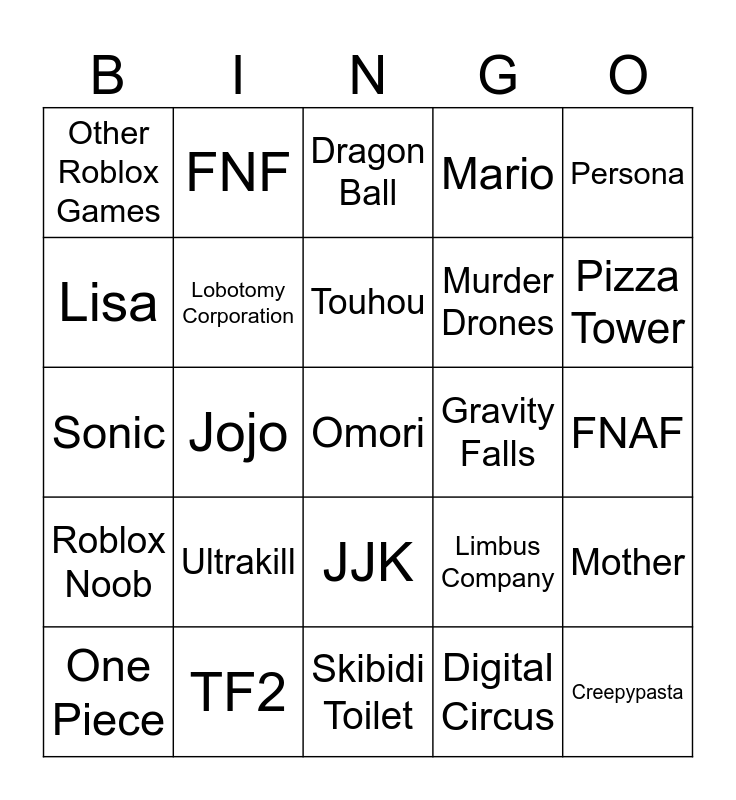 This bingo card has a free space and 24 words: Ultrakill, TF2, Touhou, One Piece, Persona, Other Roblox Games, Lisa, FNF, Gravity Falls, JJK, Murder Drones, Sonic, Limbus Company, Mother, Lobotomy Corporation, Digital Circus, FNAF, Dragon Ball, Pizza Tower, Jojo, Creepypasta, Roblox Noob, Mario and Skibidi Toilet.