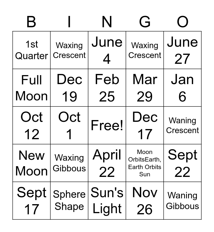 This bingo card has a free space and 24 words: Waxing Gibbous, Sphere Shape, Feb 25, Sept 17, June 27, 1st Quarter, Full Moon, Waxing Crescent, Dec 17, April 22, Mar 29, Oct 12, Moon OrbitsEarth, Earth Orbits Sun, Sept 22, Dec 19, Nov 26, Waning Crescent, June 4, Jan 6, Oct 1, Waning Gibbous, New Moon, Waxing Crescent and Sun's Light.