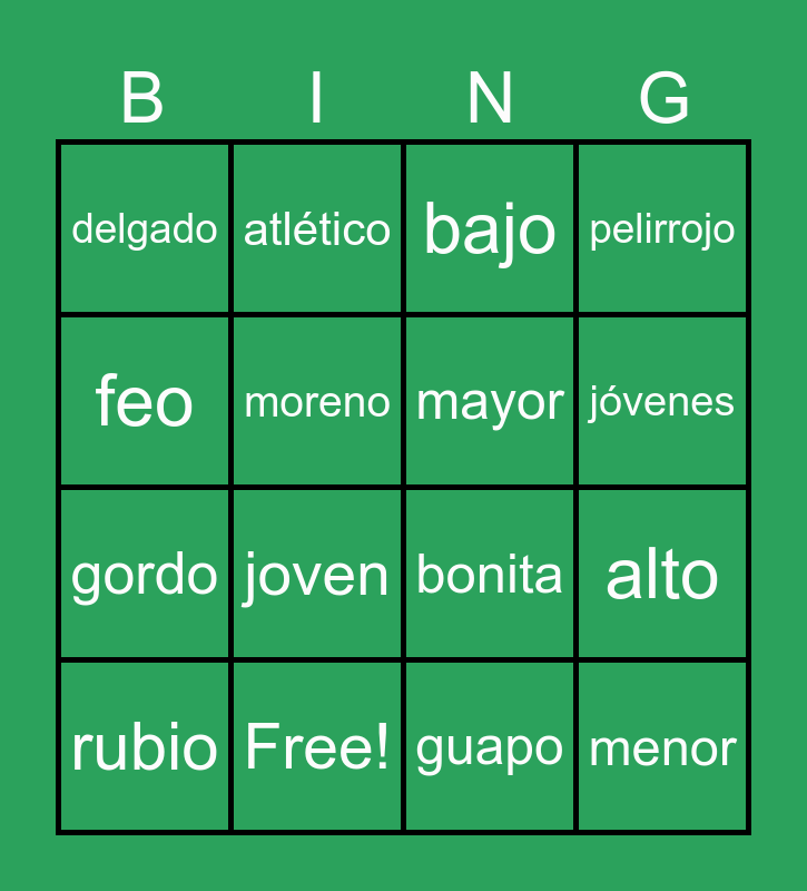 This bingo card has 16 words: Free!, alto, bajo, delgado, gordo, atlético, bonita, guapo, feo, moreno, rubio, pelirrojo, joven, jóvenes, mayor and menor.