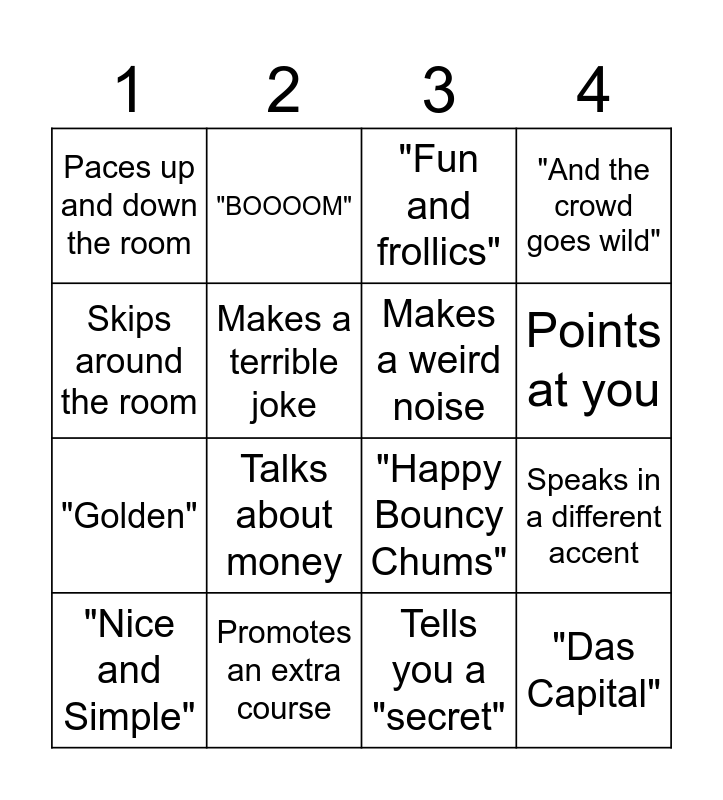 This bingo card has 16 words: "Nice and Simple", Promotes an extra course, "Fun and frollics", "And the crowd goes wild", Skips around the room, "BOOOOM", "Happy Bouncy Chums", Speaks in a different accent, Paces up and down the room, Makes a terrible joke, Tells you a "secret", Points at you, "Golden", Talks about money, Makes a weird noise and "Das Capital".