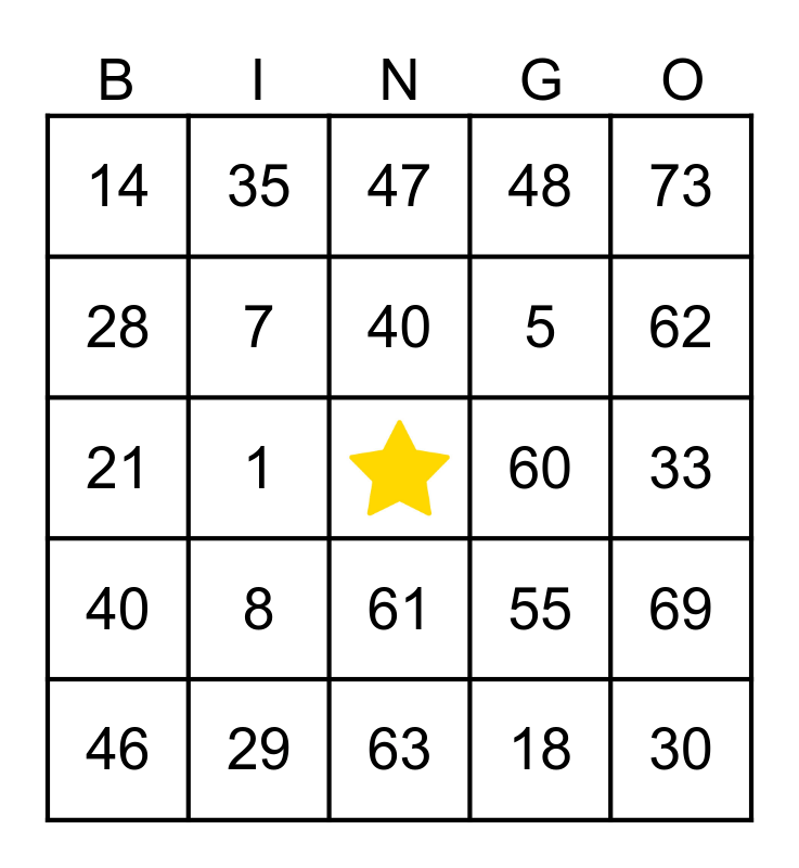 This bingo card has a free space and 24 words: 8, 29, 40, 46, 73, 14, 28, 35, 60, 61, 5, 21, 55, 69, 7, 18, 33, 47, 62, 1, 30, 40, 48 and 63.