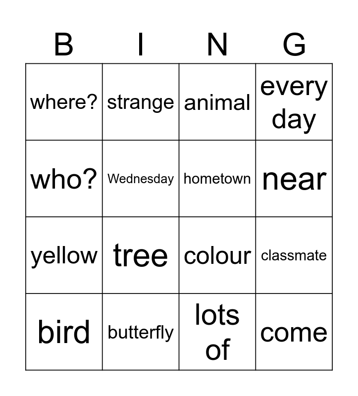 This bingo card has 16 words: butterfly, classmate, animal, where?, yellow, strange, colour, lots of, who?, Wednesday, bird, every day, tree, near, hometown and come.