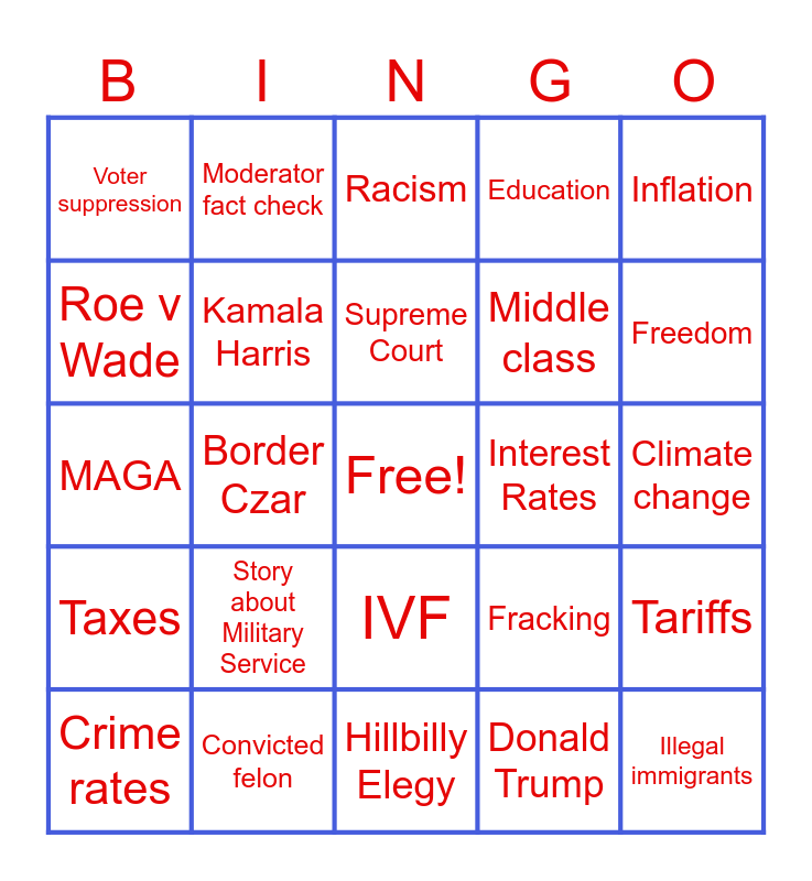 This bingo card has a free space and 35 words: Joe Biden, Weird, Haitians eating pets, Kamala Harris, IVF, Education, Roe v Wade, Lies, Supreme Court, Obamacare, MAGA, Inflation, Cost of Childcare, Coach, Voter suppression, Interest Rates, Donald Trump, Border Czar, Taxes, Illegal immigrants, Fracking, Crime rates, Tariffs, Convicted felon, Racism, Freedom, Jobs, Minnesota State Fair, Middle class, Climate change, Gun owner, Hillbilly Elegy, Story about Military Service, Moderator fact check and Project 2025.