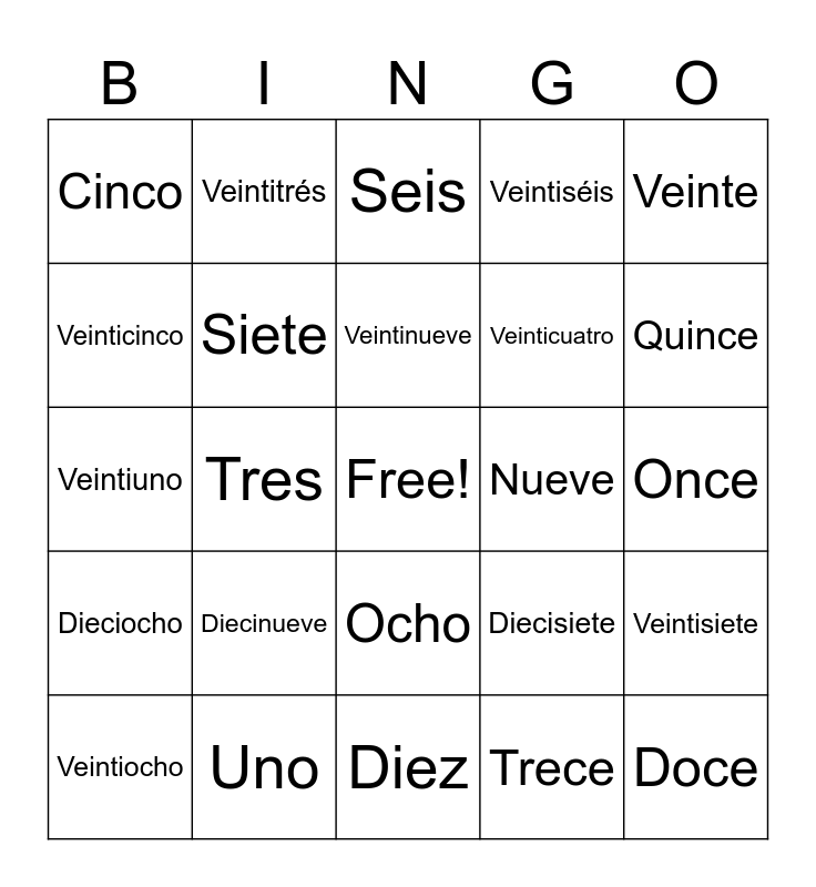 This bingo card has a free space and 30 words: Uno, Dos, Tres, Cuatro, Cinco, Seis, Siete, Ocho, Nueve, Diez, Once, Doce, Trece, Catorce, Quince, Dieciséis, Diecisiete, Dieciocho, Diecinueve, Veinte, Veintiuno, Veintidós, Veintitrés, Veinticuatro, Veinticinco, Veintiséis, Veintisiete, Veintiocho, Veintinueve and Treinta.