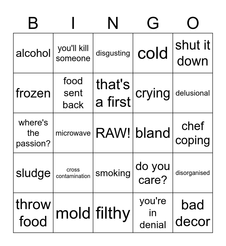 This bingo card has a free space and 24 words: cross contamination, mold, that's a first, throw food, shut it down, alcohol, frozen, you'll kill someone, bland, smoking, crying, where's the passion?, do you care?, disorganised, food sent back, you're in denial, chef coping, disgusting, delusional, microwave, bad decor, sludge, cold and filthy.