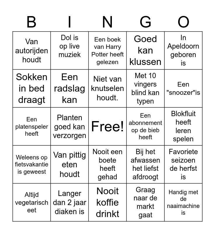 This bingo card has a free space and 24 words: Van pittig eten houdt, Langer dan 2 jaar diaken is, Niet van knutselen houdt., Altijd vegetarisch eet, In Apeldoorn geboren is, Van autorijden houdt, Sokken in bed draagt, Dol is op live muziek, Een abonnement op de bieb heeft, Nooit een boete heeft gehad, Met 10 vingers blind kan typen, Een platenspeler heeft, Bij het afwassen het liefst afdroogt, Favoriete seizoen de herfst is, Een radslag kan, Graag naar de markt gaat, Blokfluit heeft leren spelen, Een boek van Harry Potter heeft gelezen, Een "snoozer"is, Planten goed kan verzorgen, Handig met de naaimachine is, Weleens op fietsvakantie is geweest, Goed kan klussen and Nooit koffie drinkt.