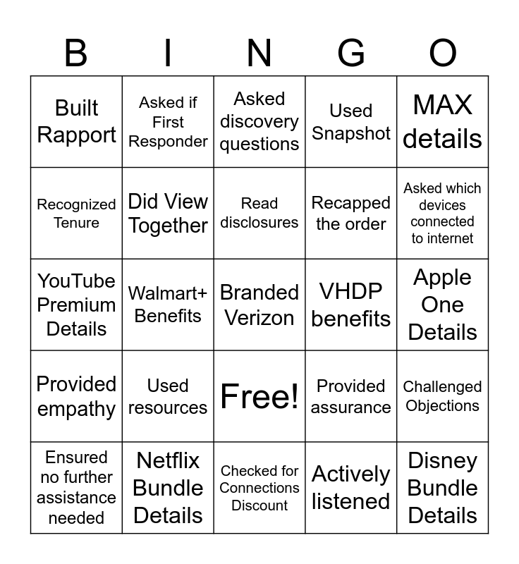 This bingo card has 26 words: Free!, Actively listened, Read disclosures, Netflix Bundle Details, MAX details, Built Rapport, Recognized Tenure, Asked if First Responder, Apple One Details, Provided assurance, Recapped the order, YouTube Premium Details, Challenged Objections, Ensured no further assistance needed, Walmart+ Benefits, GIG benefits, Used Snapshot, Provided empathy, Asked discovery questions, Branded Verizon, Asked which devices connected to internet, Checked for Connections Discount, VHDP benefits, Used resources, Did View Together and Disney Bundle Details.