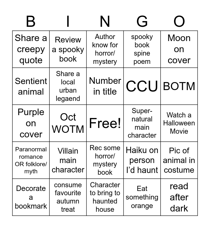 This bingo card has a free space and 24 words: Villain main character, consume favourite autumn treat, Number in title, Decorate a bookmark, Moon on cover, Share a creepy quote, Sentient animal, Review a spooky book, Super- natural main character, Rec some horror/ mystery book, CCU, Purple on cover, Haiku on person I’d haunt, Pic of animal in costume, Share a local urban legaend, Eat something orange, Watch a Halloween Movie, Author know for horror/ mystery, BOTM, Oct WOTM, read after dark, Paranormal romance OR folklore/ myth, spooky book spine poem and Character to bring to haunted house.