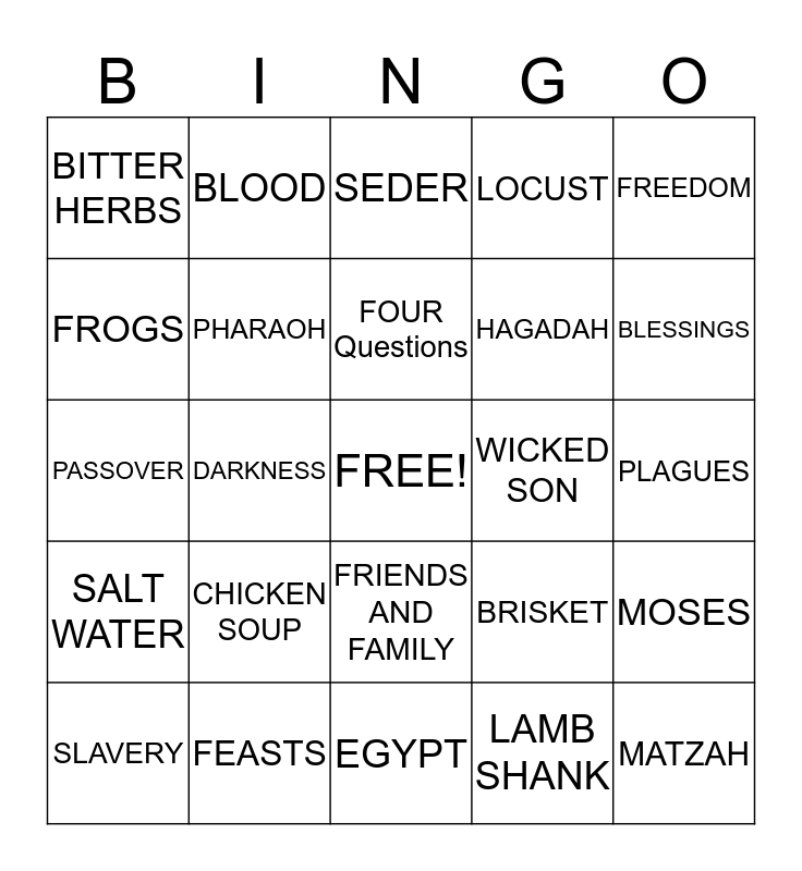 This bingo card has a free space and 24 words: CHICKEN SOUP, FEASTS, FOUR Questions, SLAVERY, FREEDOM, BITTER HERBS, FROGS, BLOOD, WICKED SON, FRIENDS AND FAMILY, HAGADAH, PASSOVER, BRISKET, MOSES, PHARAOH, LAMB SHANK, PLAGUES, SEDER, BLESSINGS, DARKNESS, MATZAH, SALT WATER, LOCUST and EGYPT.