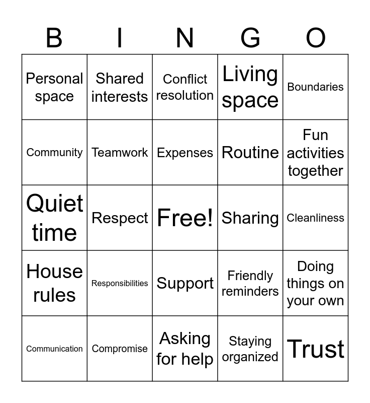 This bingo card has a free space and 29 words: Communication, Chores, Respect, Boundaries, Personal space, Conflict resolution, Teamwork, Responsibilities, Sharing, Compromise, Cleanliness, Trust, Asking for help, Staying organized, Fun activities together, Flexibility, Support, House rules, Boundaries, Quiet time, Friendly reminders, Conversations, Routine, Community, Living space, Shared interests, Doing things on your own, Expenses and Feedback.