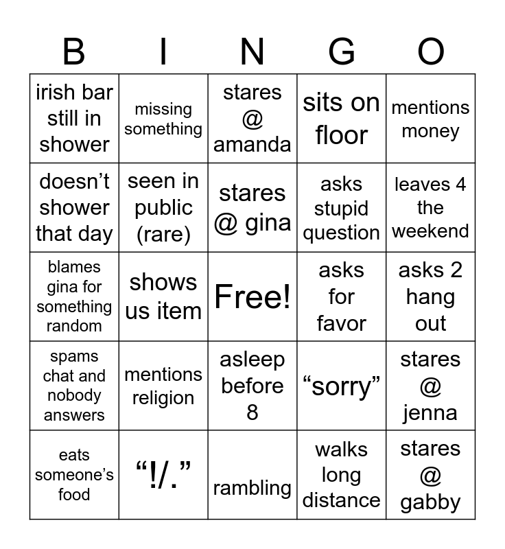 This bingo card has a free space and 24 words: mentions religion, “!/.”, stares @ gina, eats someone’s food, mentions money, irish bar still in shower, doesn’t shower that day, missing something, asks for favor, asleep before 8, asks stupid question, blames gina for something random, “sorry”, stares @ jenna, seen in public (rare), walks long distance, asks 2 hang out, stares @ amanda, leaves 4 the weekend, shows us item, stares @ gabby, spams chat and nobody answers, sits on floor and rambling.