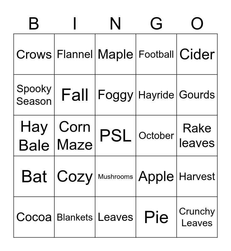 This bingo card has 50 words: Pumpkins, PSL, Jack-o-lantern, Leaves, Cozy, Sweaters, Flannel, Pumpkin Patch, Spooky Season, Halloween, Fall, Football, Harvest, Apple, Thanksgiving, Turkey, Foggy, October, November, Cider, Corn Maze, Pie, Crows, Hayride, Autumn, Crunchy Leaves, Gourds, Squash, Maple, Mushrooms, Owls, Crisp, Chilly, Cinnamon, Blankets, Corn Maze, Caramel, Festival, Pecan, Rake leaves, Soup, Scarf, Thermos, Wreath, Cocoa, Hay Bale, Cobwebs, Acorn, Bat and Scarecrow.