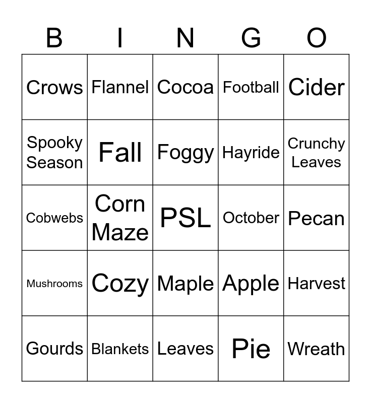 This bingo card has 48 words: Pumpkins, PSL, Jack-o-lantern, Leaves, Cozy, Sweaters, Flannel, Pumpkin Patch, Spooky Season, Halloween, Fall, Football, Harvest, Apple, Thanksgiving, Turkey, Foggy, October, November, Cider, Corn Maze, Pie, Crows, Hayride, Autumn, Crunchy Leaves, Gourds, Squash, Maple, Mushrooms, Owls, Crisp, Chilly, Cinnamon, Blankets, Caramel, Festival, Pecan, Soup, Scarf, Thermos, Wreath, Cocoa, Hay Bale, Cobwebs, Acorn, Bat and Scarecrow.