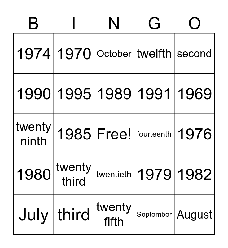 This bingo card has a free space and 44 words: April, August, January, July, June, September, October, first, second, third, twelfth, fourteenth, twentieth, twenty third, twenty fourth, twenty fifth, twenty sixth, twenty ninth, 1967, 1969, 1970, 1972, 1973, 1974, 1975, 1976, 1977, 1978, 1979, 1980, 1981, 1982, 1983, 1984, 1985, 1986, 1987, 1988, 1989, 1990, 1991, 1993, 1995 and 1997.