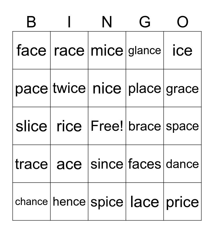 This bingo card has a free space and 24 words: ace, hence, nice, chance, ice, face, pace, race, brace, since, place, slice, faces, dance, twice, lace, space, mice, grace, rice, price, trace, glance and spice.