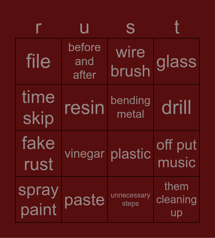 This bingo card has 20 words: spray paint, sand paper, wire brush, off put music, blow torch, vinegar, unnecessary steps, glass, fake rust, before and after, plastic, drill, file, paste, bending metal, molten metal, time skip, resin, steel wool and them cleaning up.