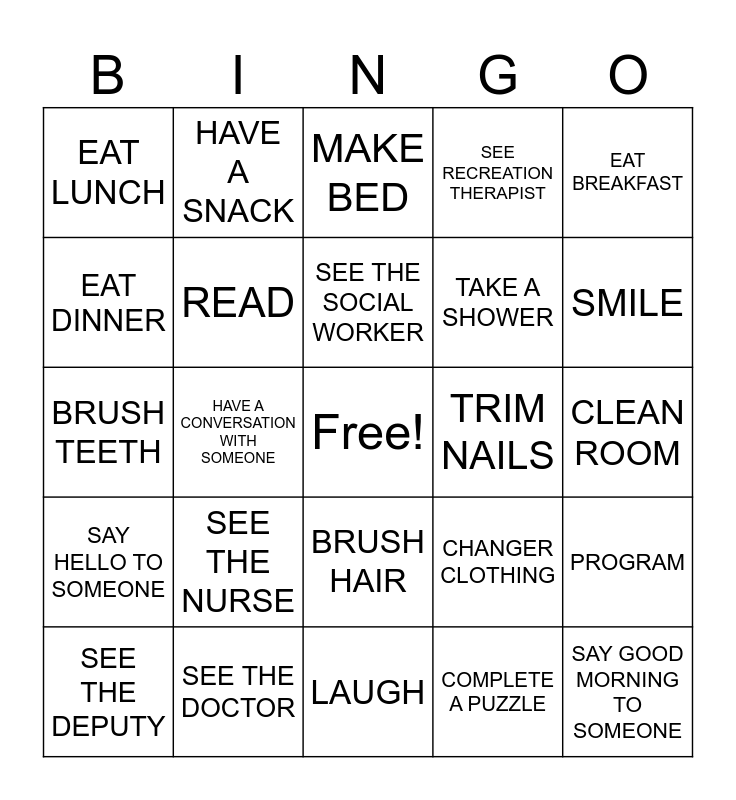 This bingo card has a free space and 24 words: SEE THE NURSE, SEE THE DOCTOR, SEE THE SOCIAL WORKER, SEE THE DEPUTY, EAT BREAKFAST, EAT LUNCH, EAT DINNER, HAVE A SNACK, TRIM NAILS, BRUSH HAIR, TAKE A SHOWER, BRUSH TEETH, CHANGER CLOTHING, PROGRAM, READ, COMPLETE A PUZZLE, CLEAN ROOM, MAKE BED, SMILE, HAVE A CONVERSATION WITH SOMEONE, SAY GOOD MORNING TO SOMEONE, SAY HELLO TO SOMEONE, SEE RECREATION THERAPIST and LAUGH.