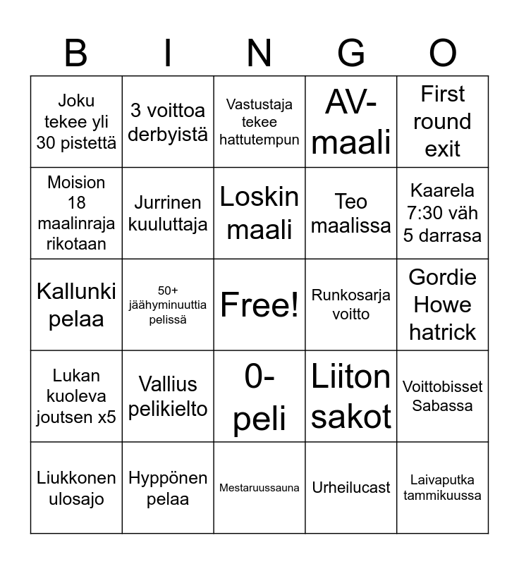 This bingo card has a free space and 24 words: Vallius pelikielto, Hyppönen pelaa, Loskin maali, Liukkonen ulosajo, First round exit, Joku tekee yli 30 pistettä, Moision 18 maalinraja rikotaan, 3 voittoa derbyistä, Runkosarja voitto, 0-peli, Teo maalissa, Kallunki pelaa, Liiton sakot, Voittobisset Sabassa, Jurrinen kuuluttaja, Urheilucast, Gordie Howe hatrick, Vastustaja tekee hattutempun, Kaarela 7:30 väh 5 darrasa, 50+ jäähyminuuttia pelissä, Laivaputka tammikuussa, Lukan kuoleva joutsen x5, AV-maali and Mestaruussauna.