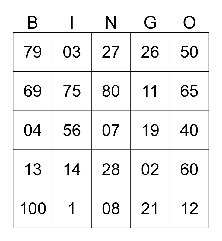 This bingo card has a free space and 24 words: 14, 1, 80, 100, 50, 79, 69, 03, 19, 28, 11, 04, 02, 60, 75, 21, 40, 27, 65, 56, 12, 13, 26 and 08.